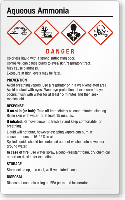 Paste this label which gives elaborate detail about dangers of aqueous ammonia. This label is a must have in your facility to so that workers are aware of every aspect of the material including its dangers, preventive measures, storage and so on.