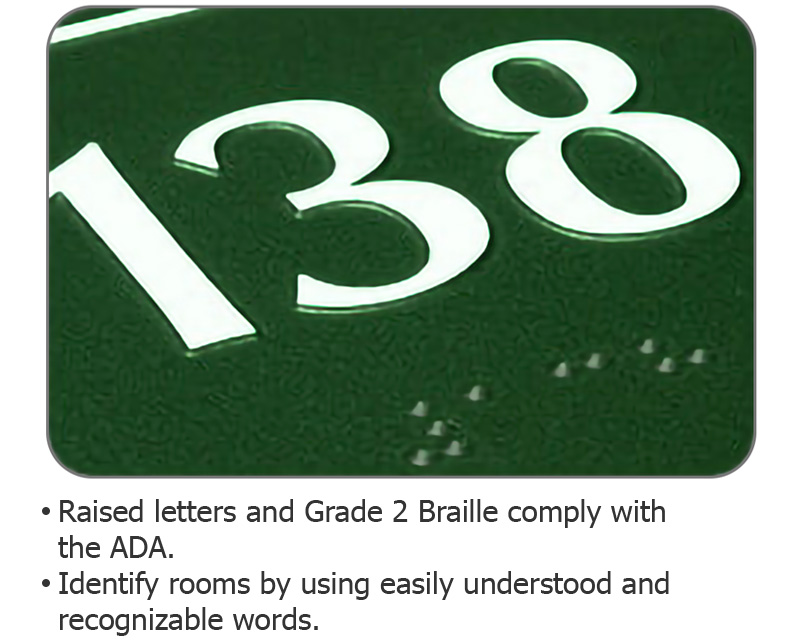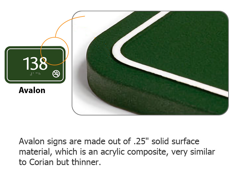 • Avalon Signs have beautifully rounded corners, clear symbols, raised letters, and Braille to suit all audiences. Crisply done borders provide an elegant and professional look.
