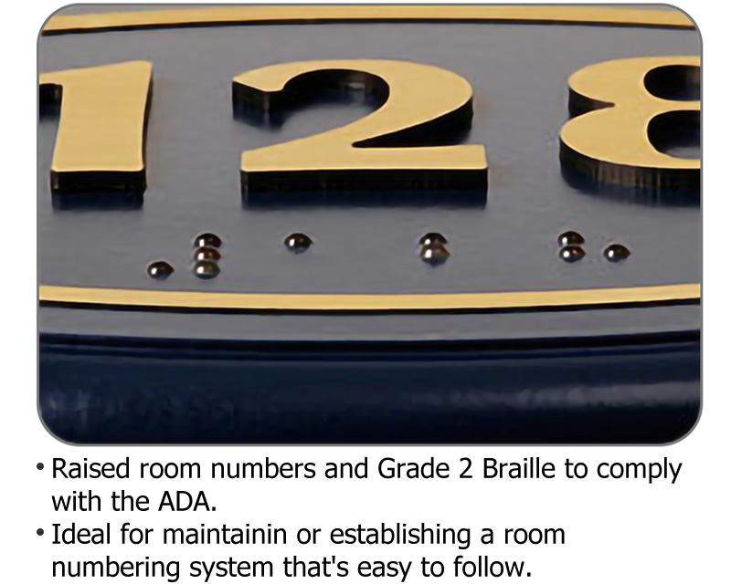 • • Get contemporary signs that meet the required ADA regulations, including Grade II Braille.