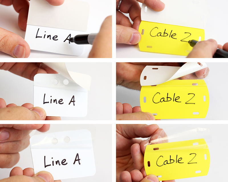 Fiber Optic Markers allow you to identify fiber optic cables below or above ground simply and efficiently. Self-Laminating Tags are easy to write on and customize for each cable. Laminating cover ensures writing stays intact and readable. Brightly colored labels are sure to attract attention and point out important cables. Tags come with slotted holes and are easily tied with nylon ties.