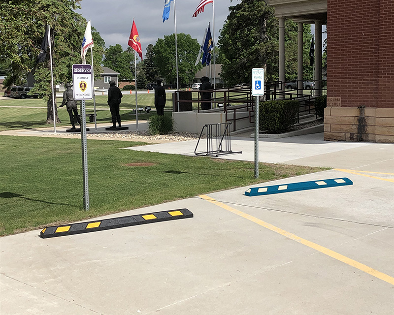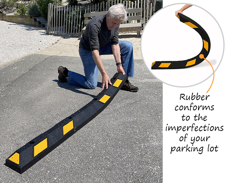 Rubber is considered to be the premium wheelstop material by parking lot managers and insiders. Rubber parking stops are flexible and last a lifetime. Most parking lots are far from perfectly flat and even. Rubber wheelstops surfaces hug the asphalt and, unlike concrete or hard plastic stops, do not “pop up” over time. Rubber parking stops require virtually no maintenance and have a lifetime guarantee against breakage.