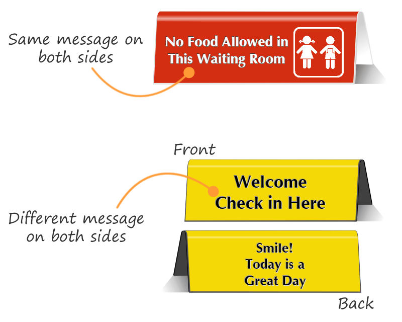 • • Table top signs provide an on-the-spot reminder of your policies. Use for a reception desk, restaurant table, or counter top.